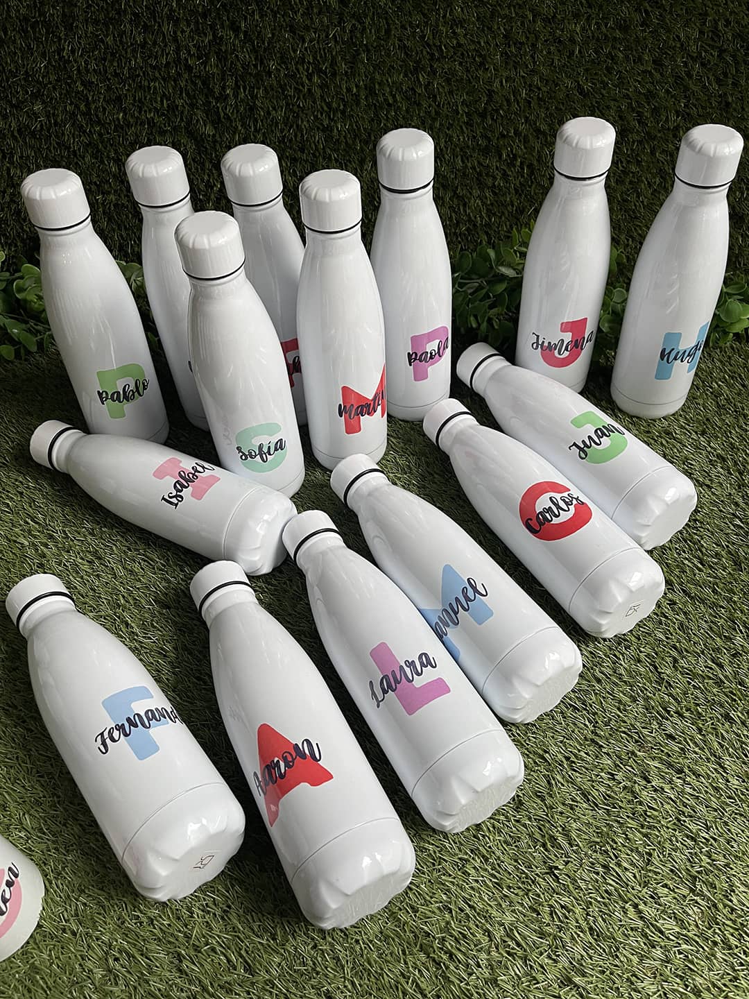 Botella de aluminio sublimable de 600 ml, personalizable con nombre o inicial. Ideal para un accesorio único y original.