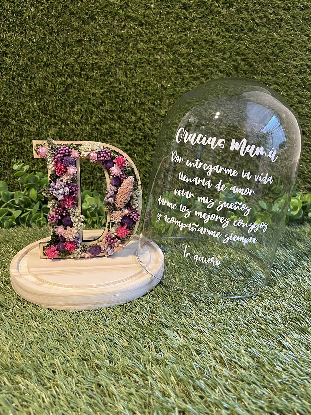 Cúpula personalizada con vinilo y letra decorada con flores preservadas. Elegante, única y perfecta para regalar.