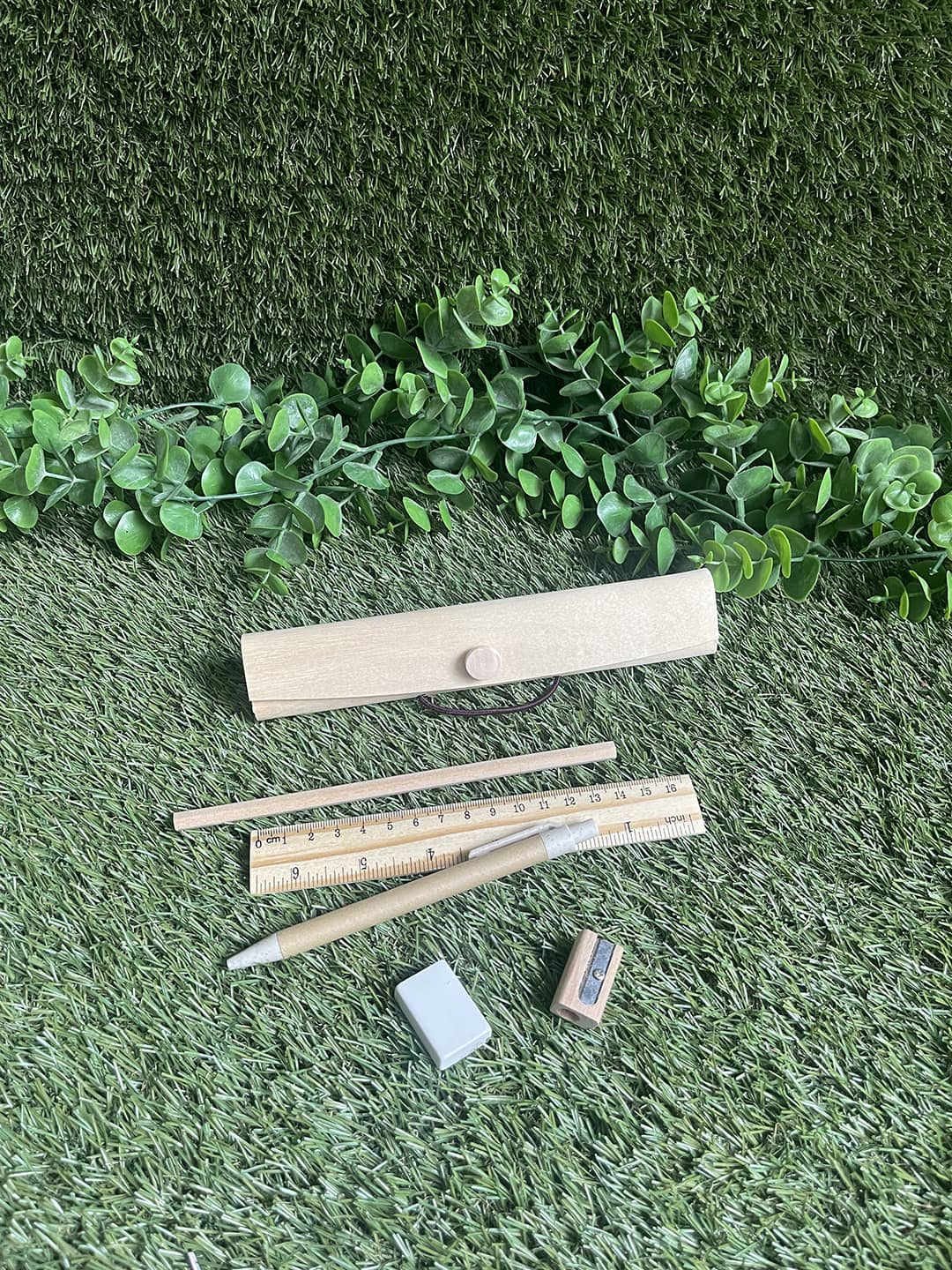 Kit de papelería compuesto por lápiz, bolígrafo, regla, goma y sacapuntas, en materiales naturales y estuche de bambú flexible personalizable con el nombre grabado a láser para un regalo único. ¡Sostenibilidad y estilo!