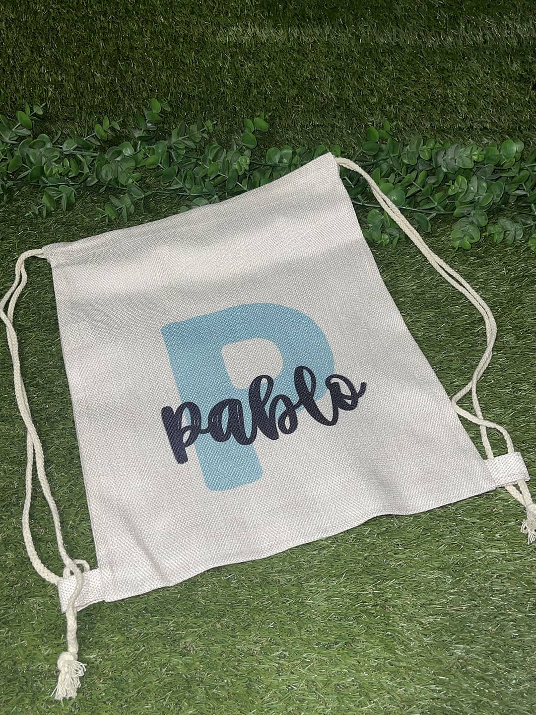 Mochila de asas de cuerda sublimable, personalizable con inicial, nombres o diseños. Práctica, ligera y perfecta para el día a día.